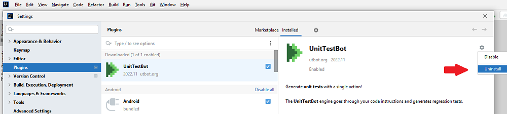 Go to File > Settings > Plugins and choose Installed. Find UnitTestBot plugin and choose the gear icon to the right of the plugin name. Click Uninstall, then click Apply. Restart if prompted.