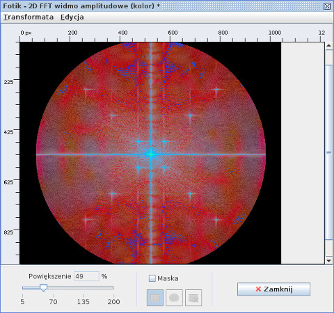 - Usunięcie częstotliwości odwzorowanych na warstwie maski (podobnie jak w oknie obrazu możliwość wielu zaznaczeń prostokątnych i eliptycznych).